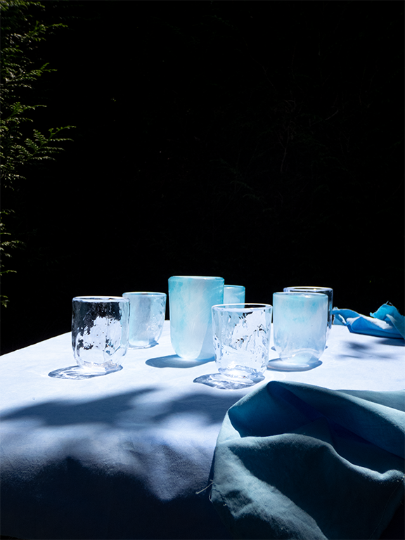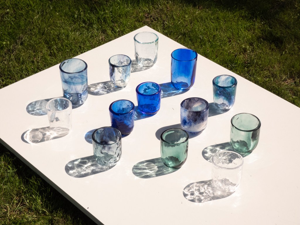 Ces gobelets ont été fabriqués à Wolverhampton, en Angleterre, en 2021. Ils font partie d’une série de recherches et d’expérimentations sur la couleur et la texture du verre. Chaque verre a été marbré sur une plaque de céramique texturée, puis soufflé dans un moule à taille variable, pour créer une succession de forme unique.